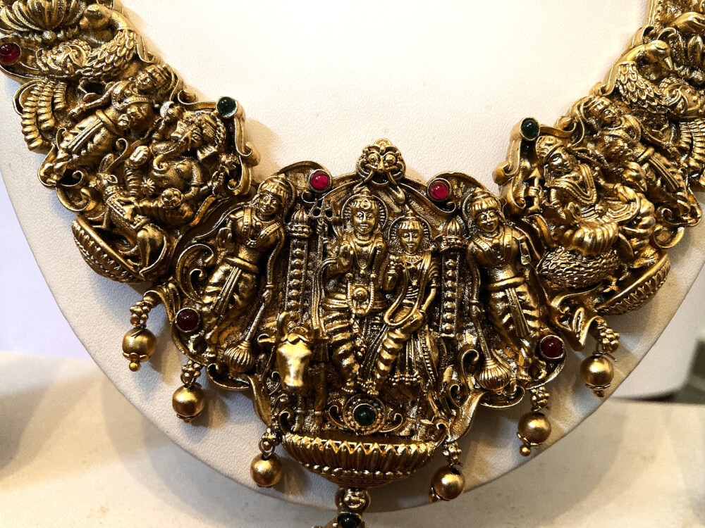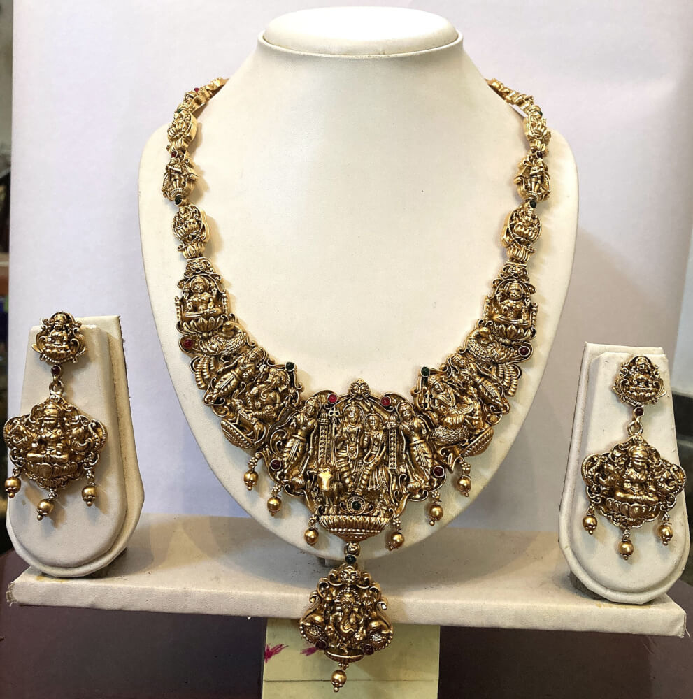 Perfect for festive occasions, temple visits, rituals, classical dance events, and cultural celebrations, this necklace offers a sophisticated yet traditional charm. The antique finish lends a vintage appeal, making it a standout accessory that pairs gracefully with silk sarees, traditional outfits, and ethnic ensembles.