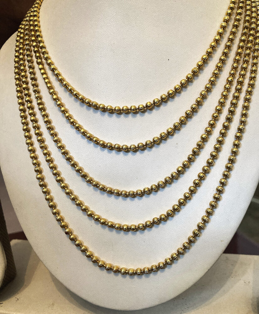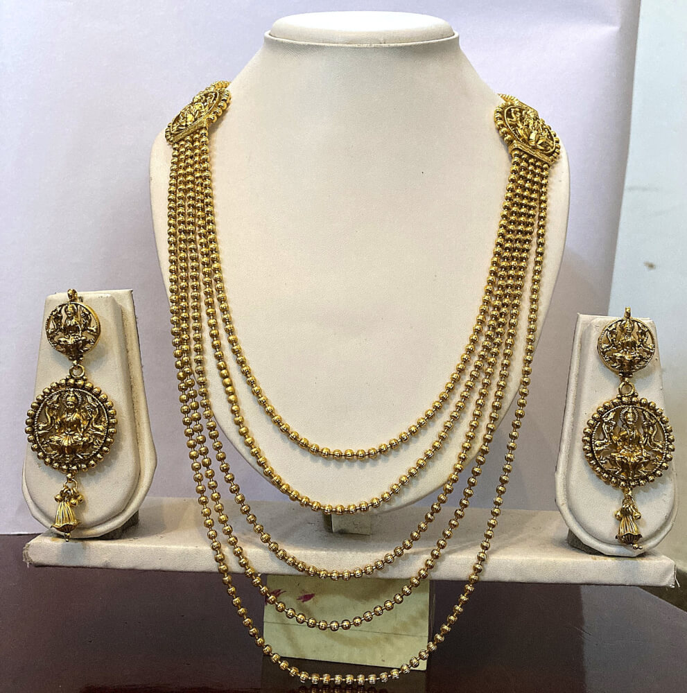 Celebrate heritage, beauty, and divine elegance with the Lakshmi Five-Step Antique Finish Ball Haram, a timeless addition to your jewelry collection.