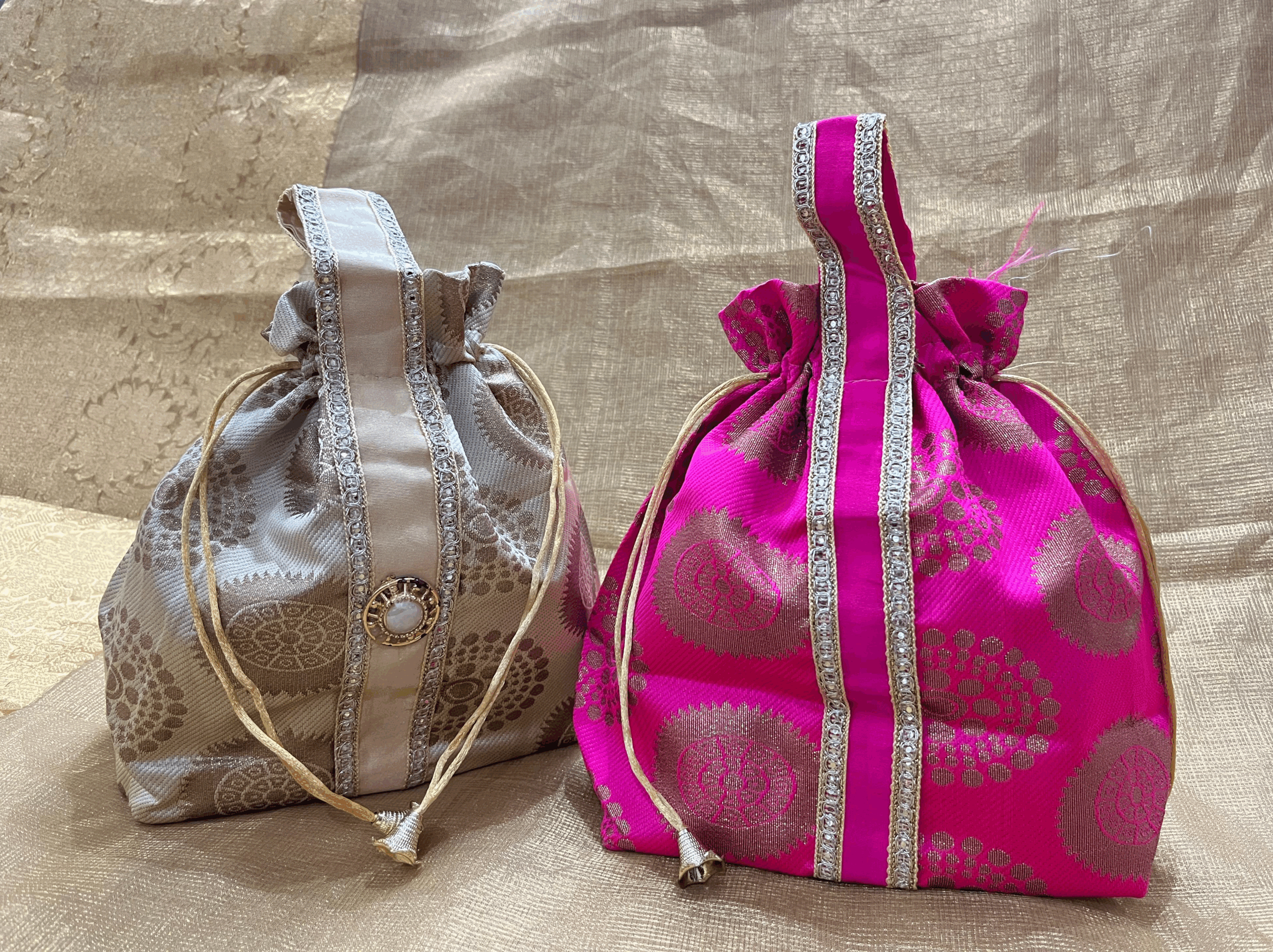 Beautiful silk or satin Potli bag in assorted designs and colors. easy handling and comes with a drawstring to secure contents.